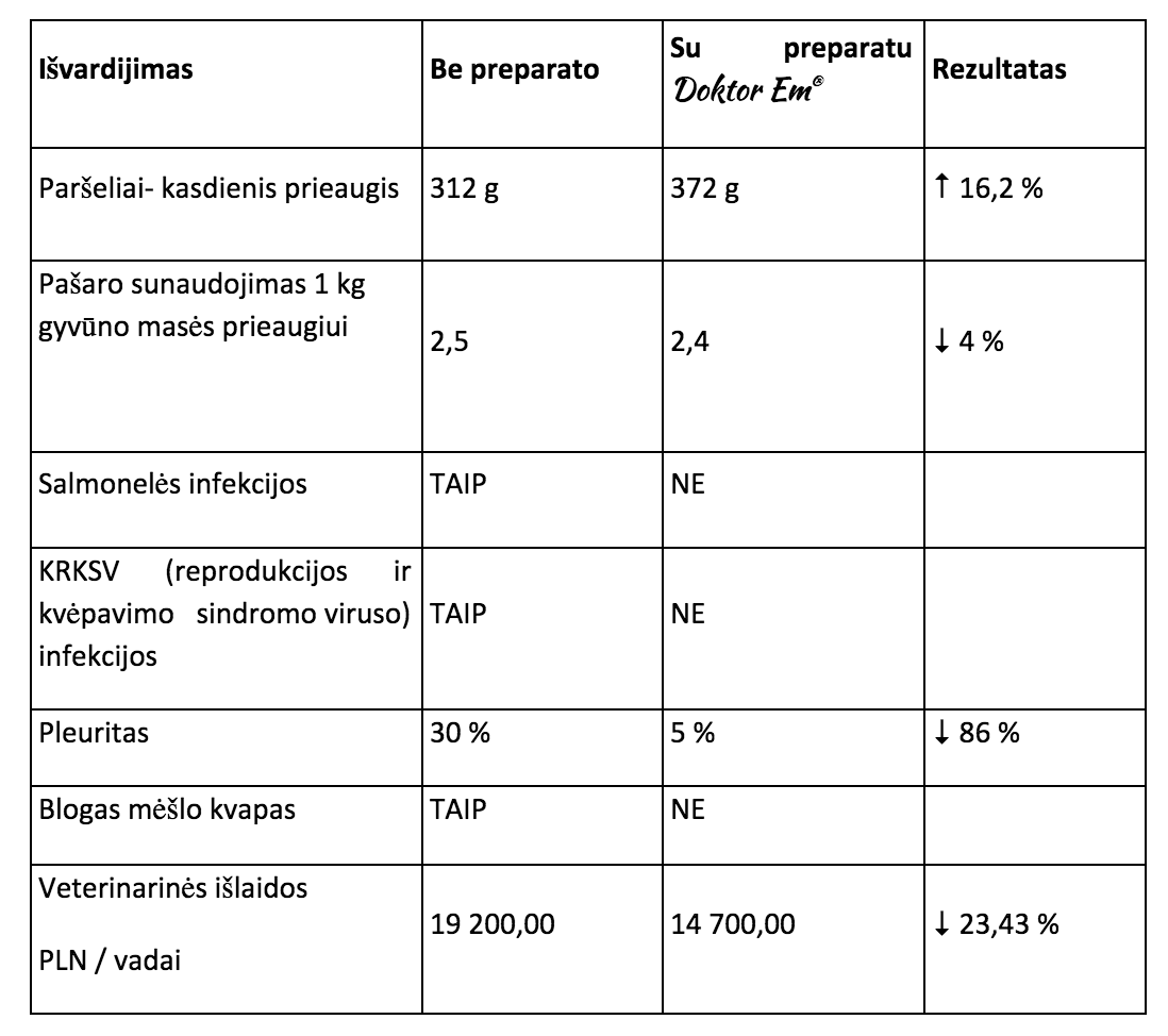 Rezultatai - tai visų pirma, labai geras broilerių svoris po 5 savaičių (2,3 - 2,4 kg), puiki sveikata, mirtingumo sumažėjimas, sausas kraikas, beveik nejaučiamas amoniako kvapas, sausas, švarus ir pilnas broilerių apsiplunksnavimas, žymiai pagėrėję mėsos skonio savybės, dėl ko didėja paklausa.